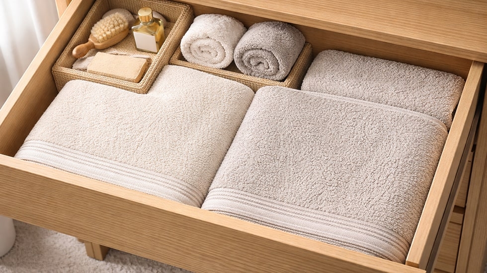 راه ساده برای تست کیفیت رنگ: یک گوشه حوله را با دستمال مرطوب بکشید؛ اگر رنگ منتقل شد، کیفیت پایین است. و نکته مهم: برای مبتدیها پیشنهاد میشود سرویس حوله را با سایر وسایل حمام (دمپایی، تنپوش، لیوان و جای مسواک) ست هماهنگ انتخاب کنند.