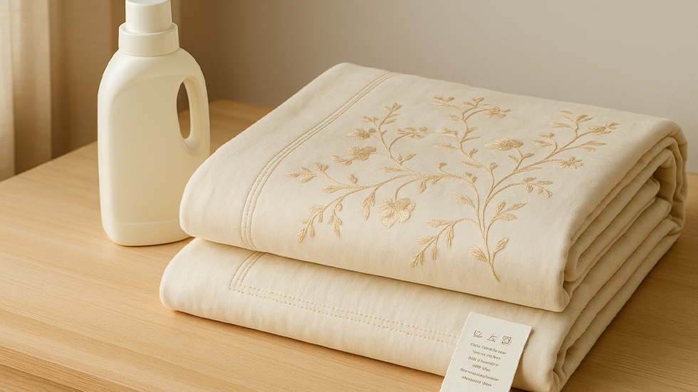 قبل از هر کاری، برچسب محصول را بررسی کنید. بسیاری از روتختیهای گلدوزی شده دستدوز یا حساس هستند و ممکن است دستورالعمل ویژهای برای دمای آب یا نوع شوینده داشته باشند.